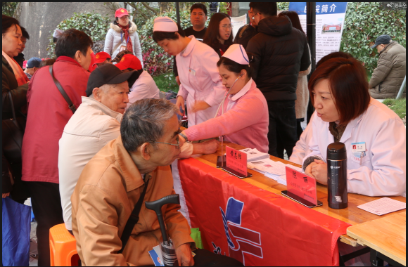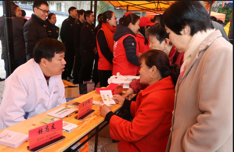 ▲ 我院志愿者們?yōu)榍皝?lái)咨詢的居民量血壓、測(cè)血糖、健康指導(dǎo)