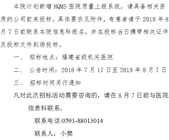 根據(jù)醫(yī)院實(shí)際工作需要,我院擬安裝“HQMS醫(yī)院質(zhì)量上報(bào)系統(tǒng)”接口軟件。
