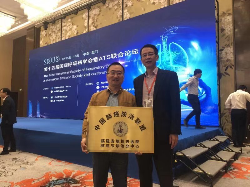 在2018年11月17日第十四屆國(guó)際呼吸病學(xué)會(huì)暨美國(guó)胸科學(xué)會(huì)(ATS)聯(lián)合論壇大會(huì)上,中國(guó)肺癌防治聯(lián)盟主席、上海市呼吸病研究所所長(zhǎng)白春學(xué)教授為我院頒發(fā)了“中國(guó)肺癌防治聯(lián)盟-福建省級(jí)機(jī)關(guān)醫(yī)院肺結(jié)節(jié)防治分中心”牌匾,成為我省首批分中心之一。