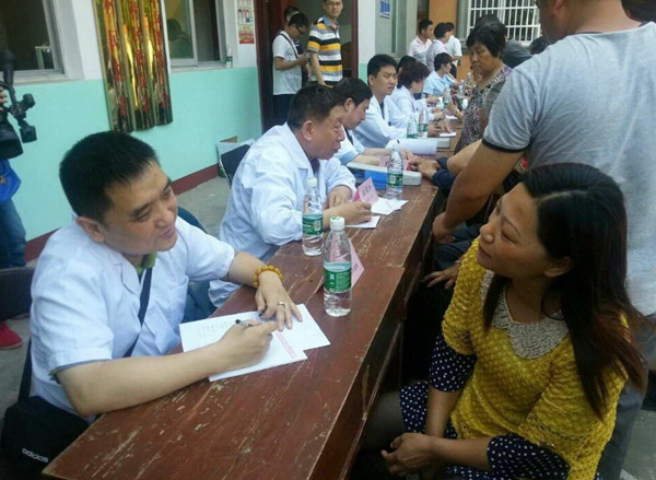 盡管當天天氣炎熱,從下午2:30開始,義診活動現(xiàn)場的鄉(xiāng)親已經排起了長龍,翹首等待活動開始。醫(yī)療專家們顧不上旅途勞累,一下車就迅速展開義診服務。他們詳細詢問村民的病情病史,進行體格檢查、認真診斷,耐心解答村民提出的各種問題。為解決語言不通的難題,南塘村委干部還為醫(yī)療專家和不懂普通話的村民充當臨時翻譯。專家在義診中發(fā)現(xiàn),前來求診鄉(xiāng)親的病情不一,病種也是多種多樣,更多的還是頸椎病、腰椎病、骨關節(jié)病、高血壓、糖尿病等常見病。即使是這樣,相當多的鄉(xiāng)親們竟然從來沒有到醫(yī)院就診過,更不用說接受系統(tǒng)的藥物及其他治療。也許這不僅與當?shù)卮迕竦木歪t(yī)意識有關,更重要的還是經濟水平的原因。
