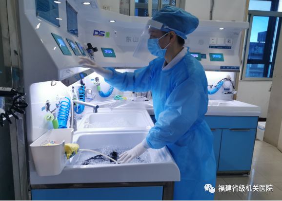 ▲工作人員在規(guī)范進行胃、腸鏡清洗消毒