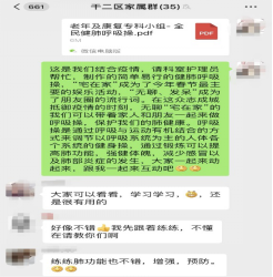 庚子年的春節(jié),是一個(gè)無比特殊且艱難的春節(jié),面對(duì)突如其來的新冠肺炎疫情,全國人民都投入到了新冠肺炎疫情防控工作中來。作為一名醫(yī)護(hù)人員,雖不是在抗疫最前線,但我們也義不容辭,悉心照顧著住院的每位患者。以往,我們都會(huì)定期舉辦健康教育講座,為患者和家屬分享知識(shí)。但今年形勢(shì)不同,為了做好防控工作,我們不適宜進(jìn)行現(xiàn)場(chǎng)健康教育講座。那怎么辦呢?組員們想。要不,我們將宣教知識(shí)分享在家屬的微信群吧。這個(gè)建議一提出,大家都積極響應(yīng)。結(jié)合疫情,我們準(zhǔn)備了簡(jiǎn)單易行的健肺呼吸操,文字配上我們自己和護(hù)理員一起示范的呼吸操圖片,簡(jiǎn)單易懂,家屬們反饋,真不錯(cuò),簡(jiǎn)單易行好操作,而且還特別貼近當(dāng)下形勢(shì)。