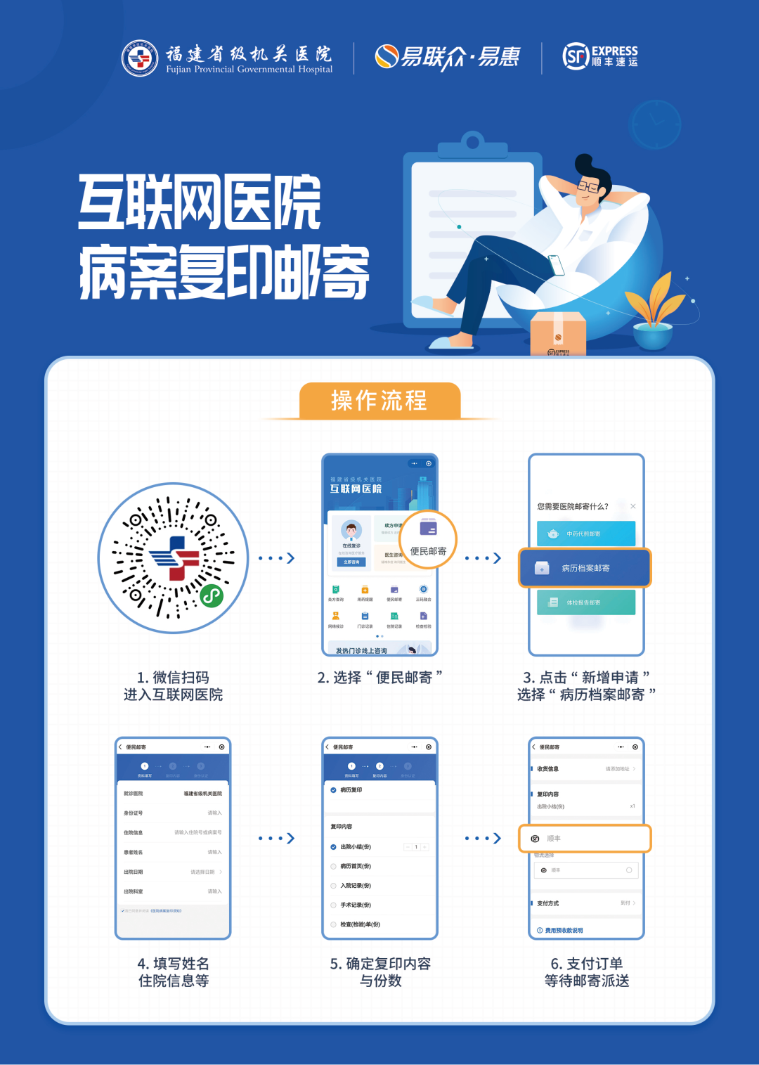 為進(jìn)一步方便患者就醫(yī),我院互聯(lián)網(wǎng)醫(yī)院上線“便民郵寄”服務(wù),病案復(fù)印、中藥代煎、體檢報告領(lǐng)取均可線上申請,郵寄到家,免跑腿、不等待!