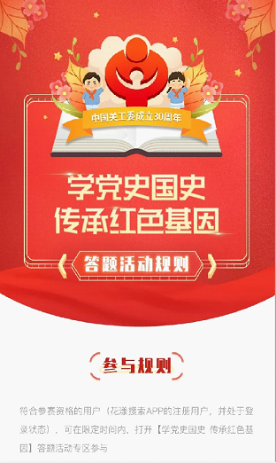 抓住各個紀念日節(jié)點和暑期、假日,積極組織青少年子女參與中國關工委組織開展的“學黨史國史,傳承紅色基因”青少年線上答題活動,進一步在青少年中掀起學習黨史國史、傳承紅色基因熱潮,把青少年愛國主義教育推向深入。答題安排兩個賽季,第一賽季從5月29日到6月19日,第二賽季從6月29日到7月19日。答題活動由中國關工委與新華社中國搜索聯(lián)合舉辦,參與者通過手機下載花漾搜索APP參與答題。