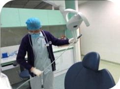 在診室醫(yī)護人員嚴格做好自己的防護措施:規(guī)范洗手、戴口罩、手套、護目鏡、面罩、穿隔離衣等。并且對接診的患者做好適當?shù)姆雷o。對于不同崗位的工作人員采取不同的防護措施。我們操作中同時使用強、弱吸引,減少飛沫、氣溶膠的產生,避免交叉感染。對所有患者在口腔診療前用0.5%過氧化氫溶液進行漱口,從而降低口腔操作產生的飛沫、氣溶膠中的微生物數(shù)量。
