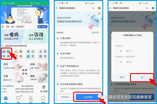 首頁點(diǎn)擊“核酸檢測”,之后點(diǎn)擊“在線申請(qǐng)”并確認(rèn)相關(guān)信息。