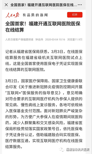 2020年3月3日,成為福建省首個(gè)獲批以及全國(guó)首家使用醫(yī)保電子憑證實(shí)現(xiàn)醫(yī)保在線結(jié)算的互聯(lián)網(wǎng)醫(yī)院。