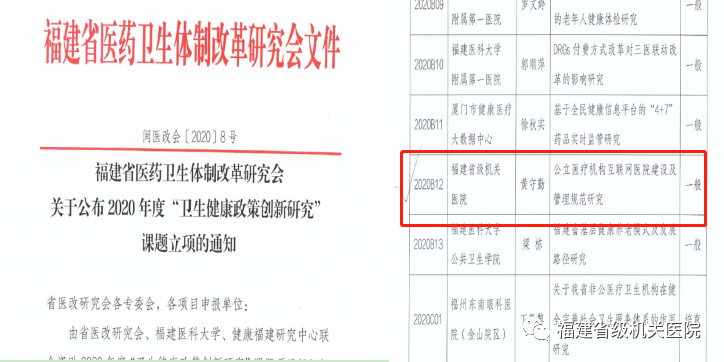2020年7月14日,“公立醫(yī)療機(jī)構(gòu)互聯(lián)網(wǎng)醫(yī)院建設(shè)及管理規(guī)范研究”入選2020年福建衛(wèi)生健康政策創(chuàng)新研究課題。