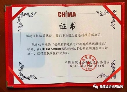 2020年11月2日,在CHIMA舉辦的“2020年醫(yī)院新興技術(shù)創(chuàng)新應(yīng)用優(yōu)秀案例”評(píng)選中獲得互聯(lián)網(wǎng)醫(yī)療優(yōu)秀獎(jiǎng)。