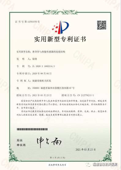 由我院睡眠醫(yī)學(xué)中心申報的關(guān)于“鼻導(dǎo)管與熱敏傳感器的連接結(jié)構(gòu)”的發(fā)明歷經(jīng)1年半的不懈努力,榮獲國家實用新型專利授權(quán)!