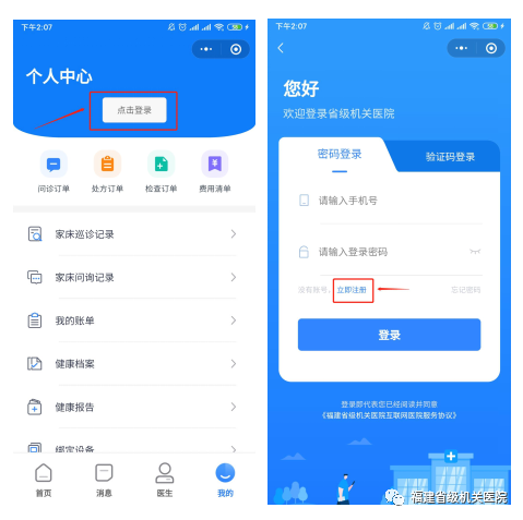 已注冊用戶:進(jìn)入互聯(lián)網(wǎng)醫(yī)院后,點擊“我的”進(jìn)入個人中心,選擇“點擊登錄”,之后可通過密碼或驗證碼進(jìn)行登錄。