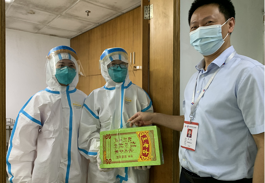 活動中,院黨委副書記、工會主席黃純帶領(lǐng)黨群辦負責人張文清等先后到預(yù)檢分診點、核酸采樣點、發(fā)熱門診走訪慰問高溫環(huán)境下工作的一線醫(yī)護人員,感謝大家為醫(yī)院疫情防控工作付出的努力。