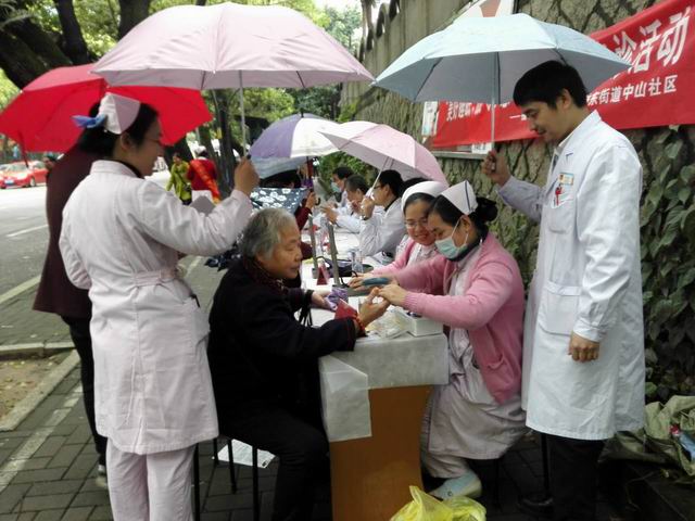 在反響熱烈的活動(dòng)現(xiàn)場,還發(fā)生了一段雨中曲,我院醫(yī)護(hù)人員發(fā)現(xiàn)義診隊(duì)伍中,有不少人沒帶雨具,仍冒雨排隊(duì)等候?qū)<伊x診,便默默為他們撐起了雨傘,這一微小舉動(dòng),令現(xiàn)場許多群眾感動(dòng)不已,當(dāng)我們祝愿他們擁有“美好睡眠,放飛夢(mèng)想”時(shí),他們也紛紛表示,“謝謝你們組織的這場義診活動(dòng),還為我們義務(wù)撐傘,你們真好!祝你們以后工作順利!”醫(yī)患和諧的笑聲,合著春雨的敲打聲,亦別有一番風(fēng)景。