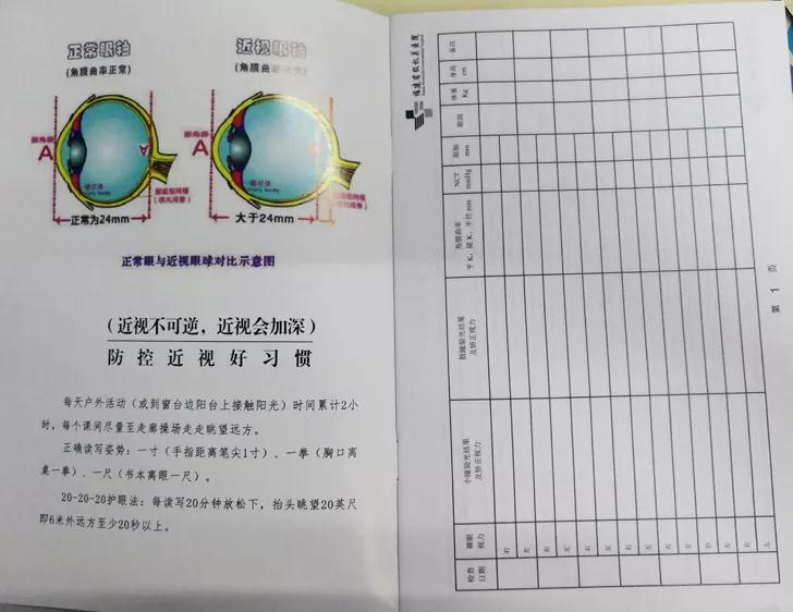 這本病歷封面上有兒童姓名、性別、年齡、出生日期等內(nèi)容,而在背面上,直觀地印著一副眼軸的圖片,對于大多數(shù)孩子來說,眼軸大于24mm就意味著近視。打開病歷后,第一頁就有很明顯的警示:近視不可逆,近視會加深。緊接著的就是防控近視的好習(xí)慣介紹,包括每天的戶外活動時間,以及正確讀寫姿勢等。