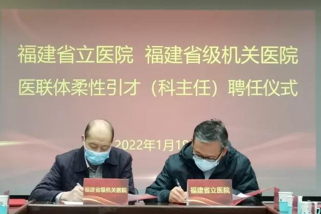 1月19日下午,福建省立醫(yī)院-福建省級機(jī)關(guān)醫(yī)院醫(yī)聯(lián)體柔性引才(科主任)聘任儀式在我院口腔中心三樓會議室舉行。省立醫(yī)院黨委書記、院長朱鵬立、黨委副書記、金山醫(yī)院黨委書記李紅、副院長郭延松、醫(yī)務(wù)部主任林孟波、組織部部長王秋蓉、主任醫(yī)師、博士生導(dǎo)師鄭曉玲、主任技師陳金花、主任醫(yī)師晉龍及我院黨政領(lǐng)導(dǎo)班子、相關(guān)科室成員參加,聘任儀式由黨委書記黃守勤主持。