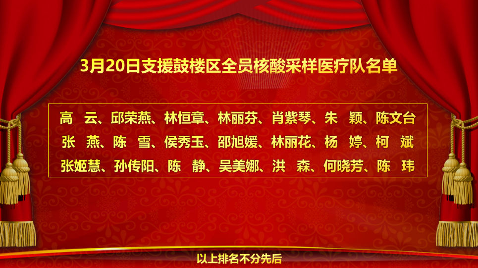 本輪疫情發(fā)生以來,醫(yī)院積極響應(yīng)省衛(wèi)健委和鼓樓區(qū)新冠肺炎疫情防控工作應(yīng)急指揮部的號(hào)召,先后選派在疫情防控與醫(yī)療救治工作中有經(jīng)驗(yàn)、能力強(qiáng)的56名骨干,分批奔赴泉州、相關(guān)社區(qū)、院校開展核酸采樣檢測(cè)工作, 體現(xiàn)公立醫(yī)院的公益擔(dān)當(dāng)。