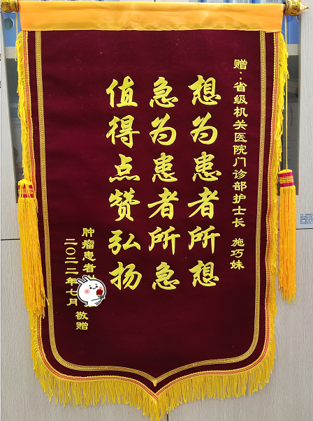 近日,一位老人家?guī)е幻嬗∮小跋霝榛颊咚搿⒓睘榛颊咚?、值得點(diǎn)贊弘揚(yáng)”的錦旗來(lái)到我院。寥寥十八字,卻語(yǔ)短情長(zhǎng),表達(dá)了老人對(duì)我院職工為群眾辦實(shí)事的感激之情和對(duì)門診辦護(hù)士長(zhǎng)施巧妹暖心服務(wù)的肯定和贊揚(yáng)。