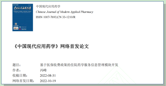 近日,我院藥劑科馮峰副主任藥師撰寫的《基于醫(yī)保收費政策的住院藥學服務記錄模塊開發(fā)》一文獲《中國現(xiàn)代應用藥學》“數(shù)智藥學”專欄快速錄用,經(jīng)學術(shù)質(zhì)量審查及優(yōu)選,已予CAJ-N網(wǎng)絡首發(fā)。