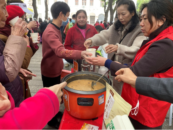 活動現(xiàn)場,黨員志愿者將分裝好的拗九粥獻給現(xiàn)場的老人及居民,大家共享拗九粥,共敘美好,話家常、道溫暖、敘友情,現(xiàn)場其樂融融。