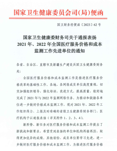 近日,國家衛(wèi)生健康委財務(wù)司通報表揚了2021年、2022年全國醫(yī)療服務(wù)價格和成本監(jiān)測工作先進單位。我院從全國千余家監(jiān)測單位中脫穎而出,榮獲“2022年度全國醫(yī)療服務(wù)價格和成本監(jiān)測工作先進機構(gòu)”稱號,成為2022年度福建省受到通報表彰的三家醫(yī)療機構(gòu)之一。