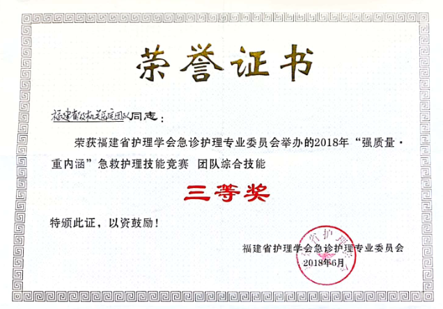 護(hù)理工作者是患者與醫(yī)院的橋梁。近年來,我院高度重視護(hù)理工作,積極鼓勵(lì)管理創(chuàng)新、服務(wù)模式創(chuàng)新、護(hù)理理念創(chuàng)新等,力求在醫(yī)療護(hù)理團(tuán)隊(duì)中形成開拓進(jìn)取的濃厚氛圍,不僅在??平ㄔO(shè)、教學(xué)科研、發(fā)明專利等方面取得了較好的成績,還先后榮獲全國敬老文明號(hào)、省三八紅旗手(集體)、省年度繼續(xù)教育先進(jìn)單位、省護(hù)理科普教育基地、省急救護(hù)理技能福建省預(yù)選賽團(tuán)隊(duì)三等獎(jiǎng)等榮譽(yù)。