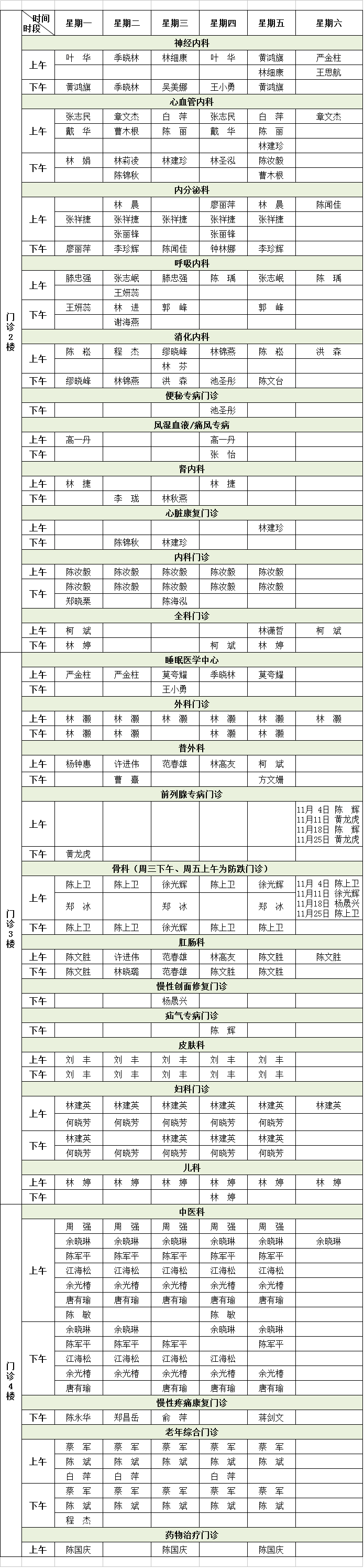 福建省級(jí)機(jī)關(guān)醫(yī)院2023年11月專家門診排班表來啦!有需要的小伙伴趕緊收藏。