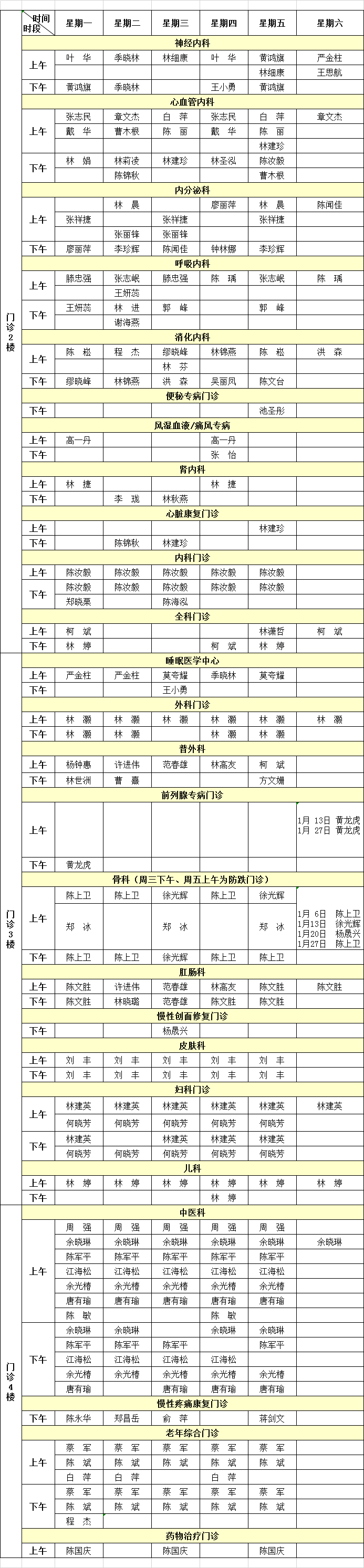 福建省級機(jī)關(guān)醫(yī)院2024年1月專家門診排班表來啦!有需要的小伙伴趕緊收藏哦。
