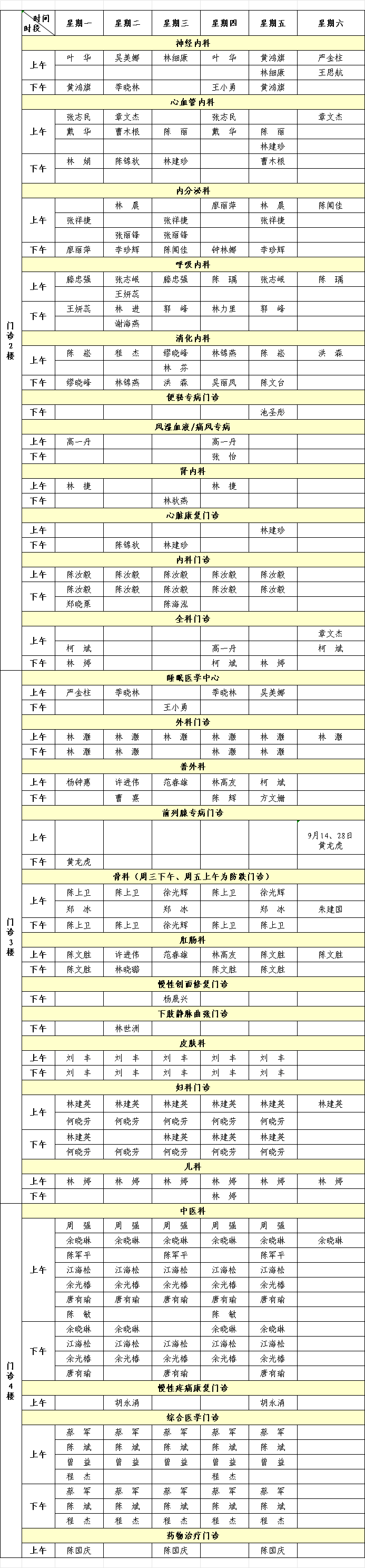福建省級機關(guān)醫(yī)院2024年9月專家門診排班表來啦,有需要的小伙伴趕緊收藏。