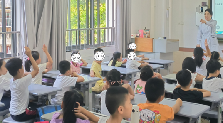 在口腔保健講座上,童薇醫(yī)師和蘇伯燦醫(yī)師借助視頻、圖片等形式向小學生們普及口腔健康知識?!澳銈冎廊艘簧杏袔赘毖例X嗎?如果牙齒外傷摔斷或脫出怎么辦?……”童薇醫(yī)師的講課深深吸引了孩子們的注意,紛紛舉手參與互動,現(xiàn)場氣氛活躍,讓孩子們輕松學到了愛牙護齒的知識。