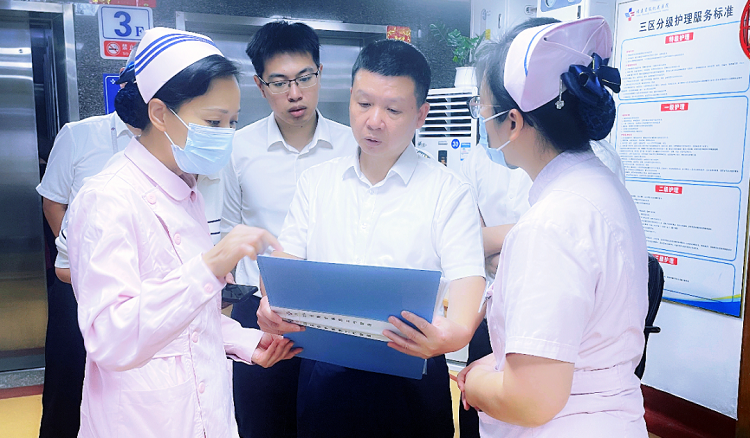 ▲調(diào)研組一行深入病房,了解“無陪護(hù)”病房試點(diǎn)工作開展情況