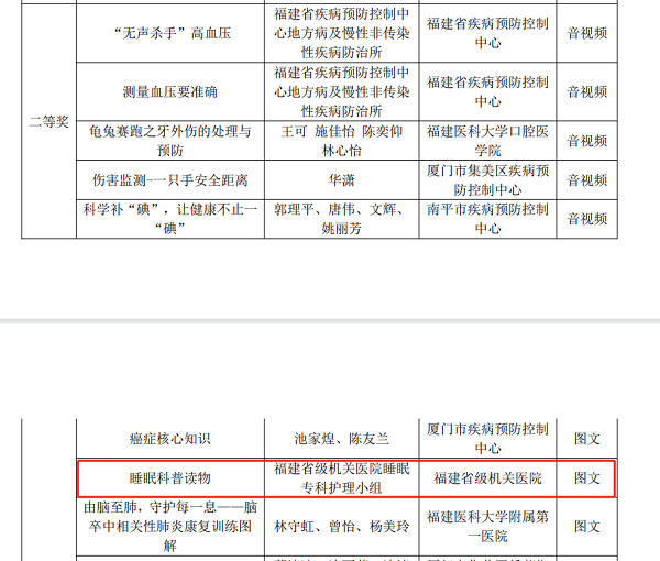 一直以來,我院睡眠??谱o理小組聚焦專業(yè),提升服務(wù),獲國家實用新型專利1項,參與并完成福建省自然科研基金2項,在研福建省衛(wèi)健委醫(yī)學(xué)創(chuàng)新課題1項、福建省教育廳中青年教師教育科研項目1項,發(fā)表睡眠相關(guān)論文5篇。 今后將以此為契機,繼續(xù)秉承科學(xué)、嚴謹、實用的原則,不斷創(chuàng)新科普形式,豐富科普內(nèi)容,為公眾提供更加精準(zhǔn)、貼心的健康科普服務(wù),助力健康福建建設(shè)。