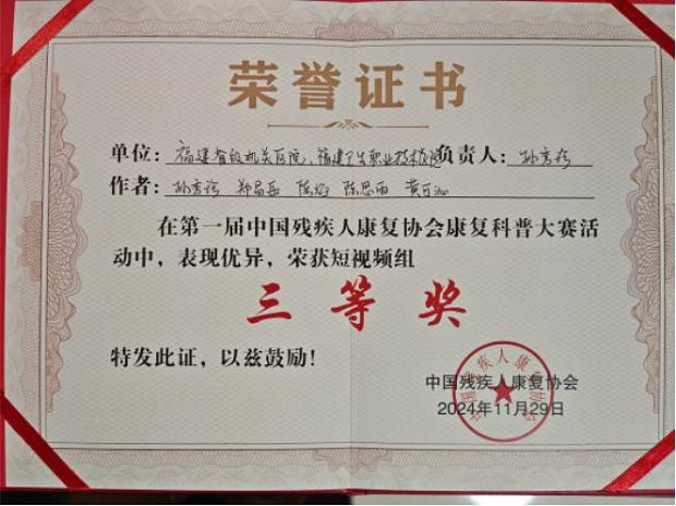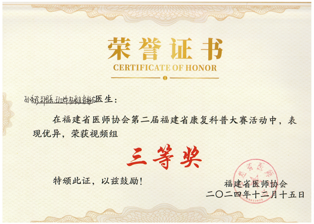 康復(fù)科團(tuán)隊(duì)“骨松,骨不松,操練起來吧”科普視頻及“一咽到底-肌少癥吞咽困難咽部訓(xùn)練技巧”獲福建省醫(yī)師協(xié)會第二屆福建省康復(fù)科普大賽三等獎(jiǎng)。