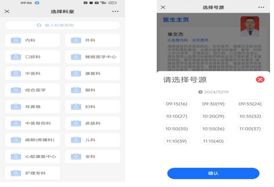 3.根據(jù)您的需求,選擇科室、醫(yī)生、就診時間。(首次就診患者需去院內(nèi)建檔后綁卡)