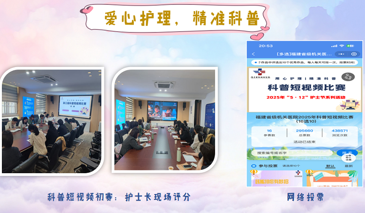 在國(guó)際護(hù)士節(jié)來(lái)臨之際,護(hù)理部舉辦 “愛(ài)心護(hù)理 精準(zhǔn)科普” 短視頻比賽,以創(chuàng)新形式拓展健康科普渠道。大賽特別增設(shè)網(wǎng)絡(luò)投票環(huán)節(jié),從擴(kuò)大傳播影響力、強(qiáng)化內(nèi)容實(shí)用性、提升公眾互動(dòng)性、保障評(píng)選公正性等維度發(fā)力,全方位展現(xiàn)護(hù)理團(tuán)隊(duì) “專(zhuān)業(yè)守護(hù)健康、創(chuàng)意傳遞溫度” 的風(fēng)采,助推健康知識(shí)廣泛普及。本次大賽共16個(gè)作品參賽,總票數(shù)達(dá)295660票,總瀏覽數(shù)達(dá)439397次,為公眾提供了學(xué)習(xí)科普知識(shí)的優(yōu)質(zhì)資源的同時(shí)也推動(dòng)了科普工作的進(jìn)一步發(fā)展。