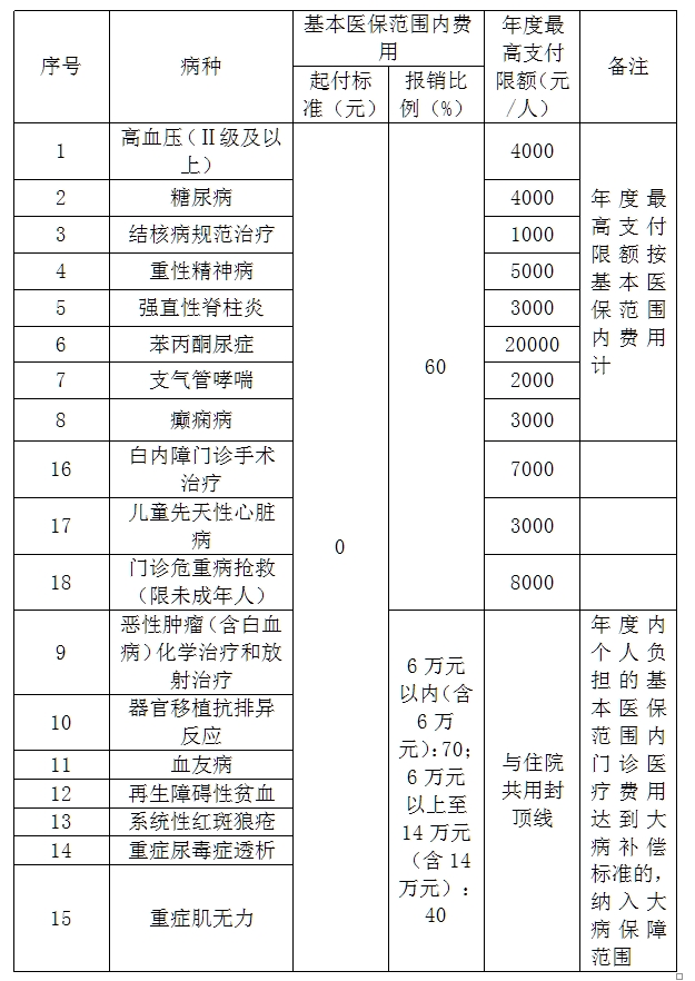 特殊病種及治療項(xiàng)目:再生障礙性貧血、系統(tǒng)性紅斑狼瘡、惡性腫瘤化學(xué)治療和放射治療、重癥尿毒癥透析、器官移植術(shù)后抗排異治療、精神分裂癥治療、高血壓病、糖尿病、苯丙酮尿癥、重性精神病人門診藥物治療、重癥肌無力、強(qiáng)直性脊柱炎、帕金森病、肝硬化失代償期、白內(nèi)障門診手術(shù)治療。