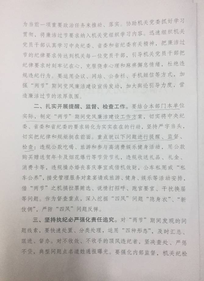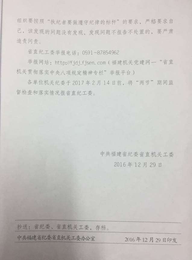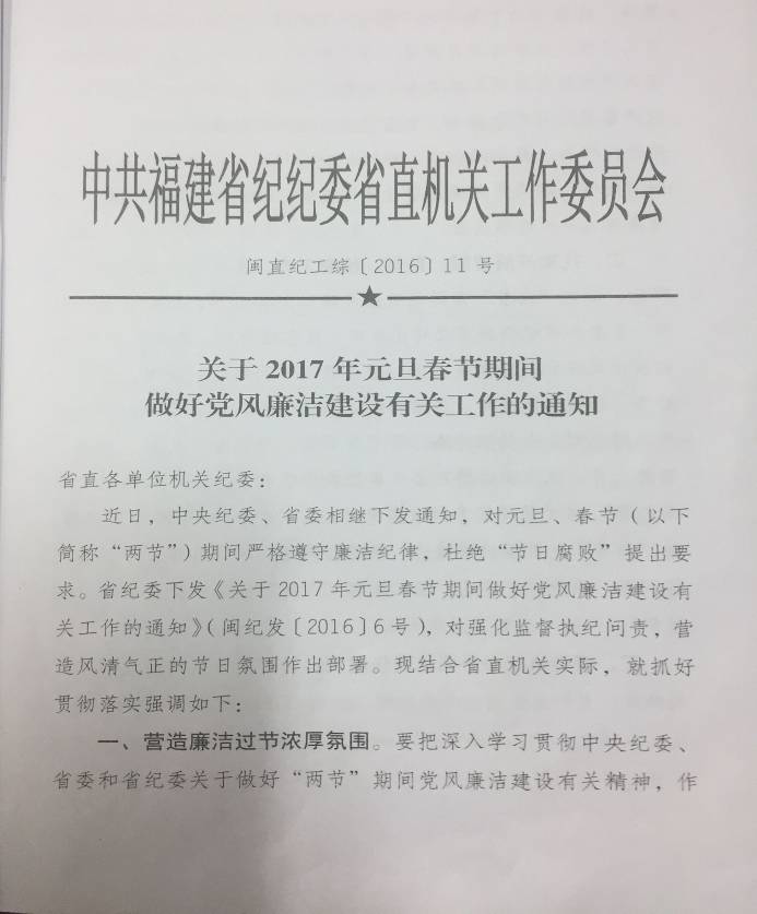 現(xiàn)將省直紀(jì)工委《關(guān)于2017年元旦春節(jié)期間做好黨風(fēng)廉政建設(shè)有關(guān)工作的通知》(閩直紀(jì)工綜[2016]11號(hào))轉(zhuǎn)發(fā)給你們,請(qǐng)迅速組織傳達(dá)學(xué)習(xí)。針對(duì)元旦春節(jié)期間,個(gè)別黨員容易發(fā)生公車私用、私車公養(yǎng)以及公款吃喝、公款旅游、公款送禮等違反黨風(fēng)廉政建設(shè)有關(guān)問題,各個(gè)黨員干部要加強(qiáng)宣傳發(fā)動(dòng),加大輿論引導(dǎo),把紀(jì)律要求時(shí)刻牢記在心,營(yíng)造廉潔過節(jié)的濃厚氛圍,嚴(yán)防“四風(fēng)”問題反彈。